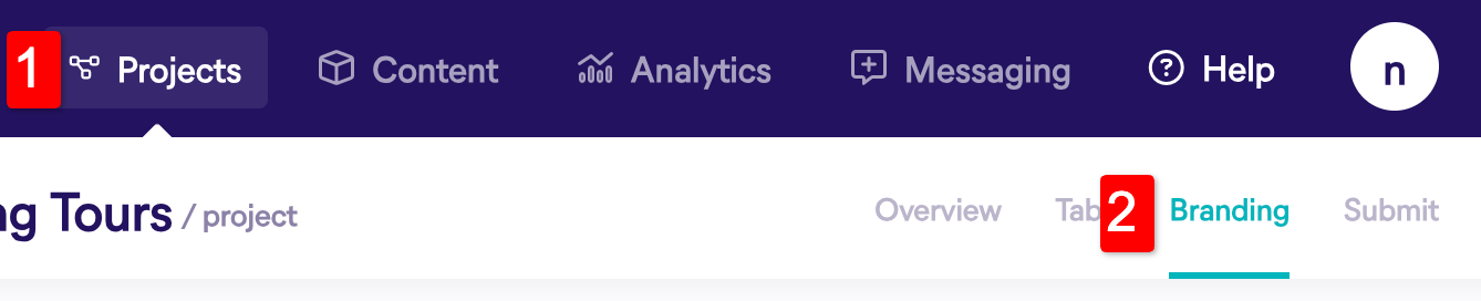 To access the app colors go to Projects (1) and then click on Branding (2). Here you will see the available options for color changes you can make to the app.