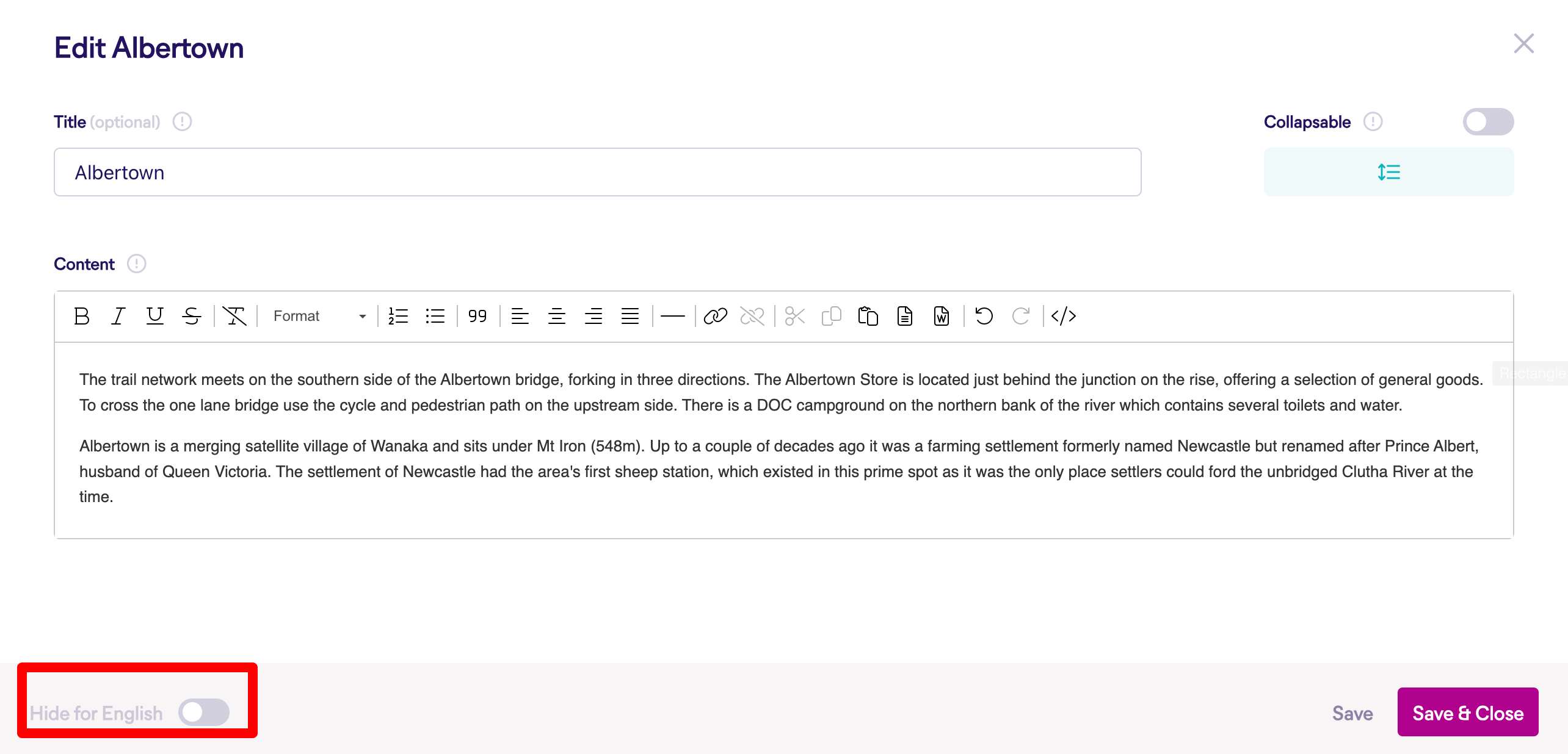 Hide sections in different languages: Customize your screen for different languages by using the toggle switch on each section. This allows you to show or hide specific sections based on the language settings, ensuring a tailored experience for each audience.